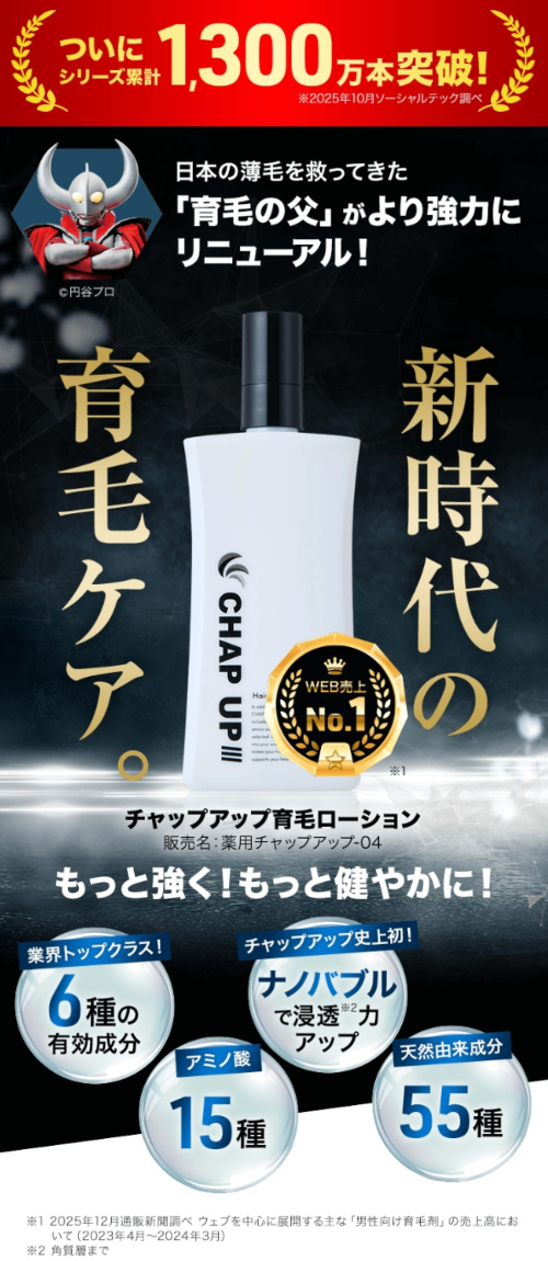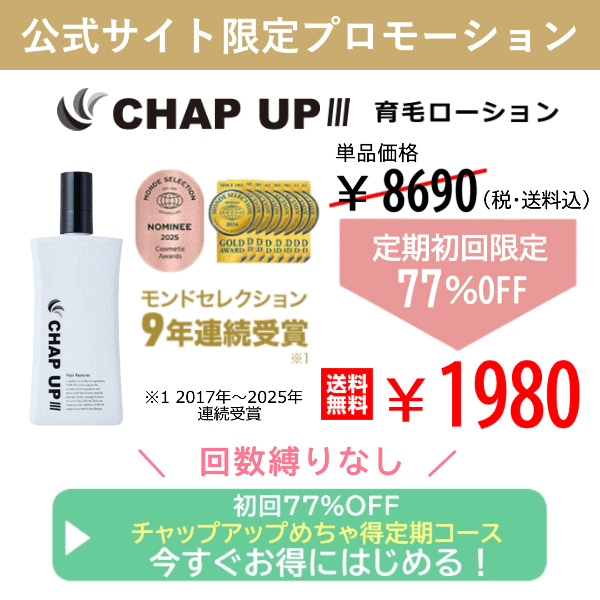 チャップアップは、成分・安全性・実績をしっかり押さえながらも、始めやすい価格設計 になっており、シリーズ累計1300万本突破&モンドセレクション9年連続受賞の大人気育毛剤です!