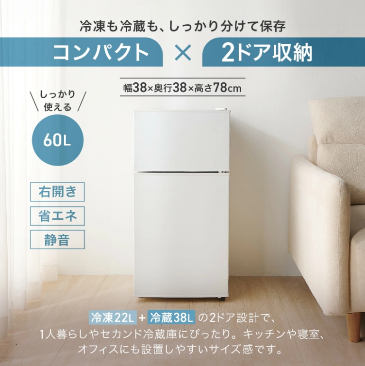 ① 総容量60L(冷蔵38L/冷凍22L)の使いやすい2ドア設計